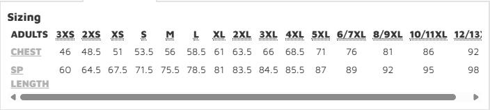 • XXS, XS, Small, Medium, Large, X Large, 2X Large, 3X Large, 4X Large, 5X Large, 6/7XL, 8/9XL, 10/11XL, 12/13XL